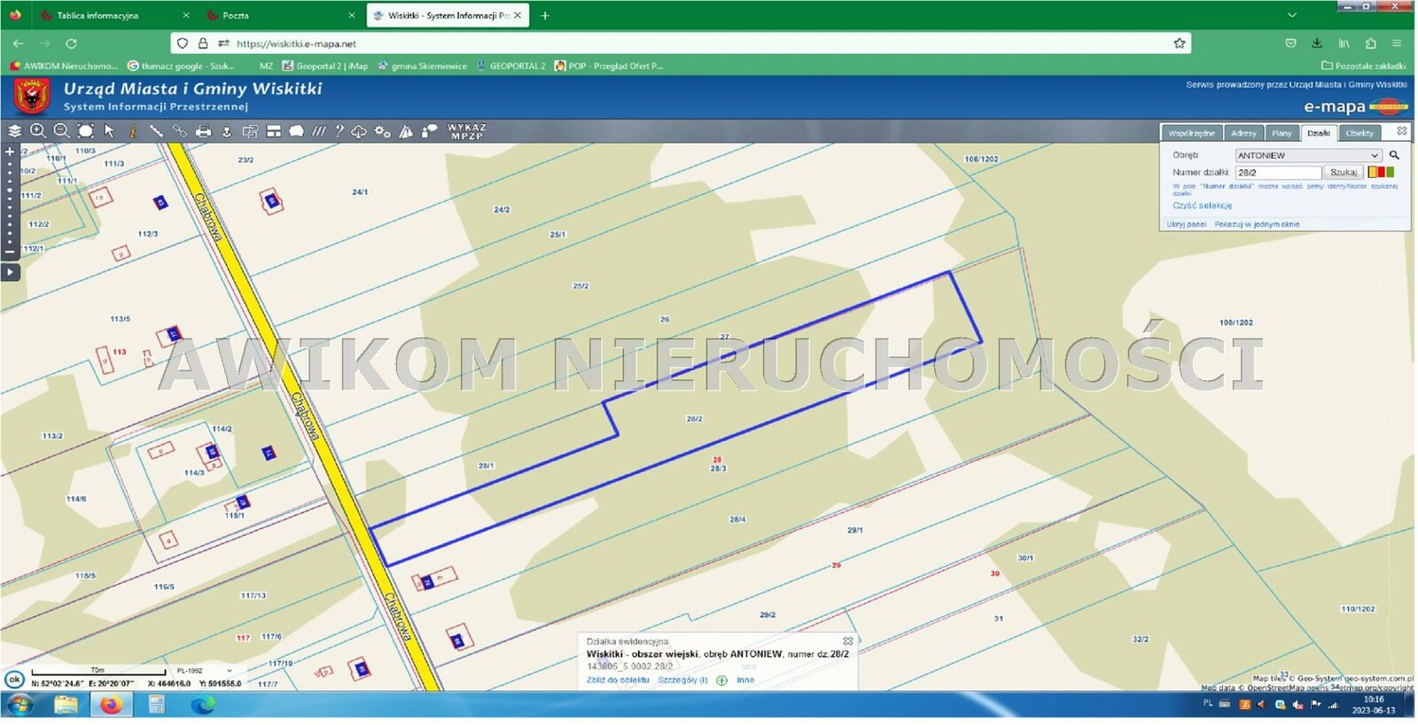 Działka rolna w części porośnięta drzewami usytuowana w miejscowości Antoniew gm. Wiskitki pow. Żyrardowski na skraju Puszczy Bolimowskiej oznaczona nr ewidencyjnym 28/2. Położona bezpośrednio przy drodze asfaltowej na terenie suchym, porośnięta brzózkami i sosnami. Możliwość uzyskania warunków zabudowy i podziału na mniejsze działki budowlane. Szerokość przy drodze gminnej 24 metry następnie po 130 metrach szerokość 45 metrów. Media - woda, prąd w ulicy przy działce. Bardzo dobry dojazd do W-wy, Skierniewic, Grodziska Maz. - 10 km do obwodnicy Żyrardowa lub do węzła A2 w Wiskitkach. Blisko do Jesionki i Radziwiłłowa Maz. Sklepy, szkoła, kościół, do stacji PKP 1,5 km. Bardzo polecam.Oferta wysłana z systemu Galactica Virgo